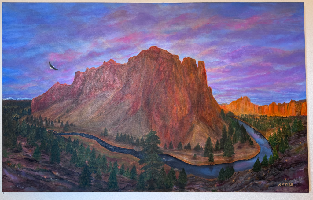 An Eagle at Smith Rock. Acrylic on Canvas by Nicola Rose Walters, January 2025. Dimensions: 48″ x 30″
